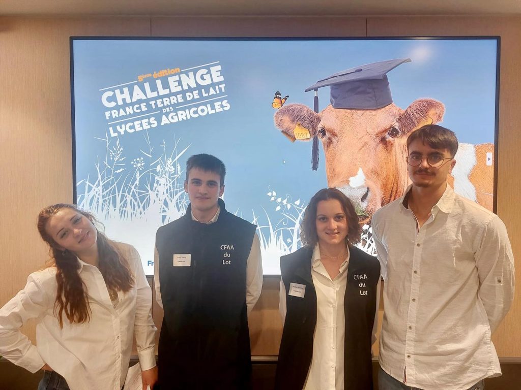 Le 2 avril 2025, quatre apprentis en BTSA Productions Animales du CFAA-CFPPA du Lot ont brillamment décroché la 3ème place du Challenge France Terre de Lait, organisé par le CNIEL à Paris. Cet événement national, qui valorise les exploitations laitières engagées dans une production durable, a réuni 22 équipes venues de toute la France.